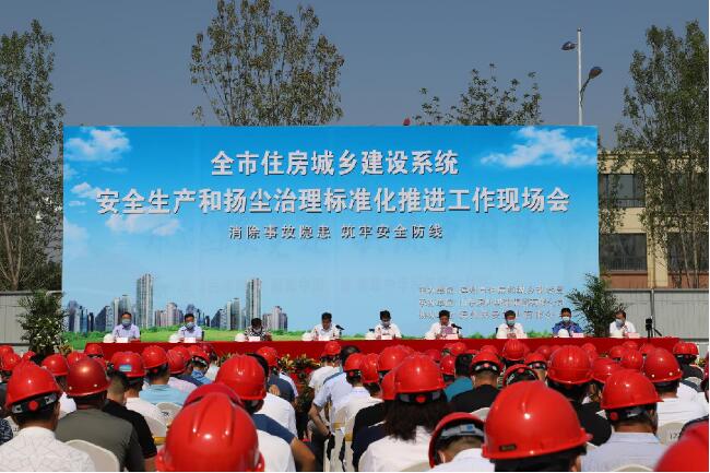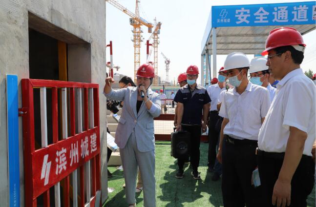 為了進一步提升我市房屋建筑工程安全防護、揚塵治理標準化和規范化水平,推動我市建筑企業安全防護和揚塵治理水平再上新臺階。6月20日,全市房屋建筑工程安全生產和揚塵治理標準化現場觀摩活動在山東濱州城建集團有限公司承建的民安鵲華苑工程施工現場舉行,活動圍繞2020年全國安全生產月——“消除事故隱患,筑牢安全防線”的主題,著眼當前全市住建領域的揚塵治理形勢,大力營造“人人重視安全、人人關注環保”的良好氛圍,掀起安全生產和揚塵治理標準化工地的創建高潮。此次觀摩活動由濱州市住房和城鄉建設局主辦,山東濱州城建集團有限公司承辦,濱州民安置業有限公司協辦。市政府辦公室黨組成員辦公室副主任梅振鵬、市住房和城鄉建設局局長孫文利、市住房和城鄉建設局副局長張海濱、市城建服務中心副主任張樹林、濱城區住房和城鄉建設局局長張亮、開發區綜合執法局局長封涌波、濱州城建集團有限公司董事長曹慶訓、總經理孟慶國、濱州民安置業有限公司經理曹亮以及濱城區、開發區建設主管部門安全、揚塵管理機構負責人;市城建服務中心、市市政服務中心、市住建局建管質安科、人防工程科、開發中心、市質管站、綜合執法大隊、市安管站建筑工地揚塵治理包保片區人員;市本級、濱城區、開發區各房屋建筑工地項目經理。共計約220余人出席觀摩會。